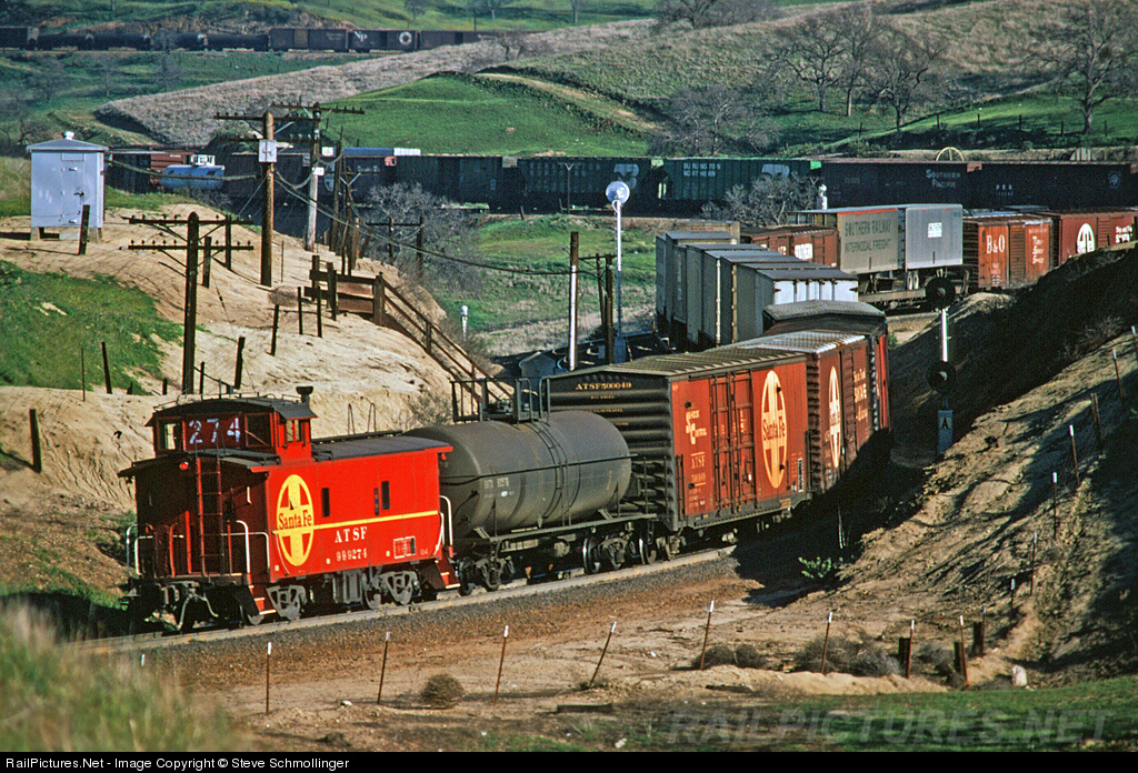 As one of Santa Fe's ubiquitous red cabooses brings up the rear of an eastbound drag at tunnel 2, several westbounds wait for it to clear so they can continue their descent to Bakersfield. At over 13,000 feet in length, Bealville siding has been a favorite location for the dispatcher to make meets and hold trains when traffic is heavy. From this location it's easy to see the elevation gained by the line as it proceeds eastward.