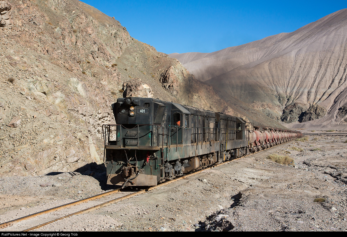 | GR12 # 401 (former EFE Dt 13001 from 1962) and # 91 (former Codelco, built in 1965) of Ferronor are pulling 23 empty sulphuric acid tank cars from Llanta through the gorge of the Salt River (Quebrada del Rio de la Sal) towards Potrerillos. |