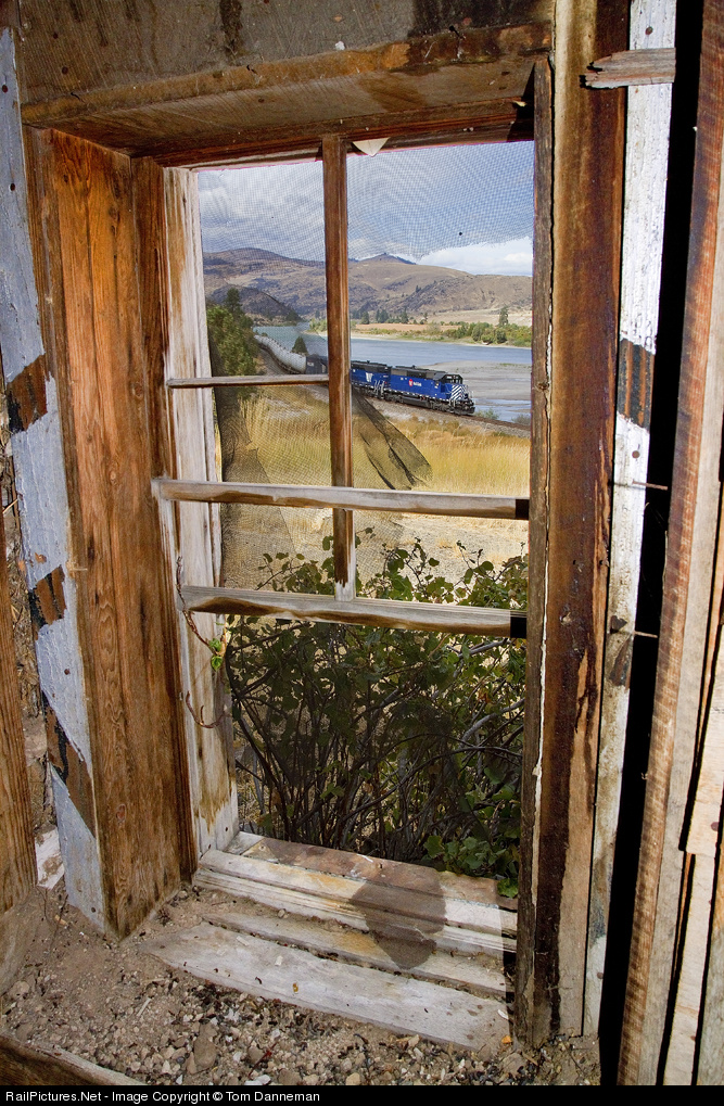 Here we are looking out of the window of an abandoned homestead at the eastbound Montana Rail Link Gas Local east of Perma, Montana. On the point is SD40-2XR no. 256. This place has seen better days, but what a view they had!