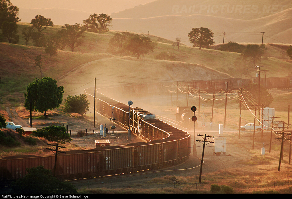 The brake shoe haze and dust kicked up by a downhill Santa Fe coal train catches the reddish rays of the setting sun at the east end of Bealville. This heavy coal load is headed for a cogenerator in the San Joaquin Valley.