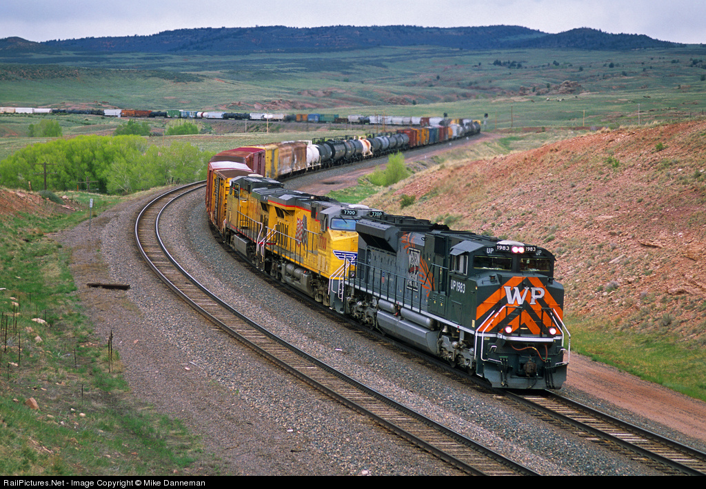 | Union Pacific's Western Pacific heritage locomotive No. 1983 leads an eastbound freight at Hermosa, Wyoming, on May 28, 2009. |