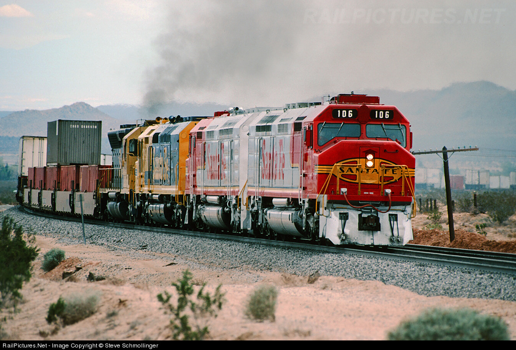 Not long after being repainted back into the red & silver, a pair of FP45s leads a Santa Fe 589 train up the steep grade out of Mojave, CA, on Tehachapi's southeastern slope. The smoke here is coming from an SD45 in the consist, which appears to have an ailing turbocharger. The 589 typically carried both piggyback and container traffic and originated in Houston, TX.
