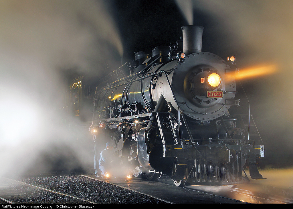 | Surrounded by steam. The headlight beam of New Haven 2-8-2 3025 slices through the steam that surrounds the locomotive as the night shop crew inspects and preps her for the next day's work, shuffling cars along the Connecticut River. |