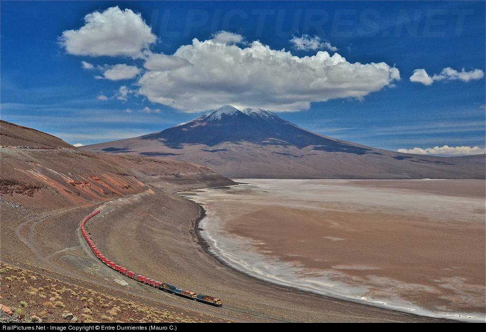 | In a magnificent place, the Salar de Carcote located right in the Andes at 4000 meters above sea level, this train FCAB rail company that transports zinc concentrate, and is completing his long journey, coming to town next of Ollague. |