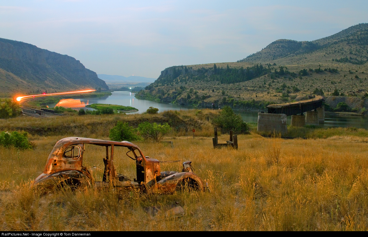 A full moon illuminates an old rusty car and what's left of Lombard, Montana, as a BNSF coal train rolls east. Lombard is where Milwaukee Road's Pacific Extension crossed the Northern Pacific's main. What's left of the Milwaukee Road bridge over the Missouri River, and the two MRL bridges over Sixteen Mile Creek are visible. The former NP main is now Montana Rail Link's 2nd Subdivision.