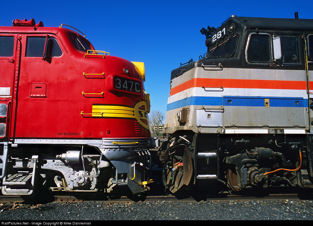 Beauty and the Beast? Two passenger locomotives, now out of work and on display at the California State Railroad Museum in Sacramento on March 7, 2003. Both were built by Electro-Motive Division; Santa Fe F7 No. 347C built in 1949 and Amtrak F40PH No. 281 built in 1978, face off on a nice sunny day. Compare a 1949 Chevy to a 1978 Impala and you’ll see amazingly similar styling traits in their respective era. Almost everyone will have a preference on which is there favorite, but you have to admit, both served their carriers well.