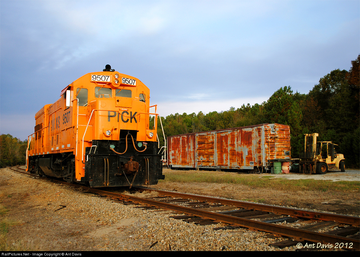 | After getting a wash, PICK 9507 rests next to the 'shop' in Docheno in the form of an old and original Pickens Railroad Boxcar. Usually the power is parked at the PCA Plant in Honea Path, but whenever work or in this case a wash down is due, the power is left somewhere in the yard in Docheno. |