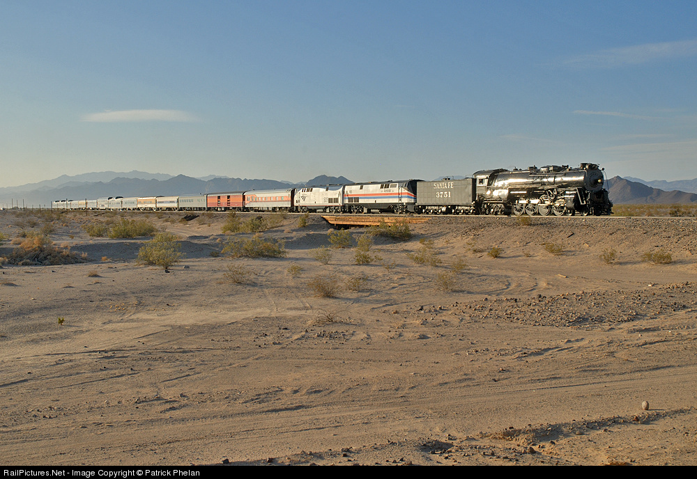 Only 3 miles out of Cadiz, ATSF 3751 sets off with the Grand Canyon Limited into a desert sunset at a blistering 15 MPH. It would be a long night for the train crew and their passengers on the slow road to Parker, AZ. Turns out, it would also be a long night for the railfans chasing, especially those that took the "dirt road of doom" to follow the railroad and got stuck in the sandy soil. As for me, I took the paved roads to Parker via Needles, arriving two hours before the train, and feeling much refreshed the next morning knowing my car did not get stuck.