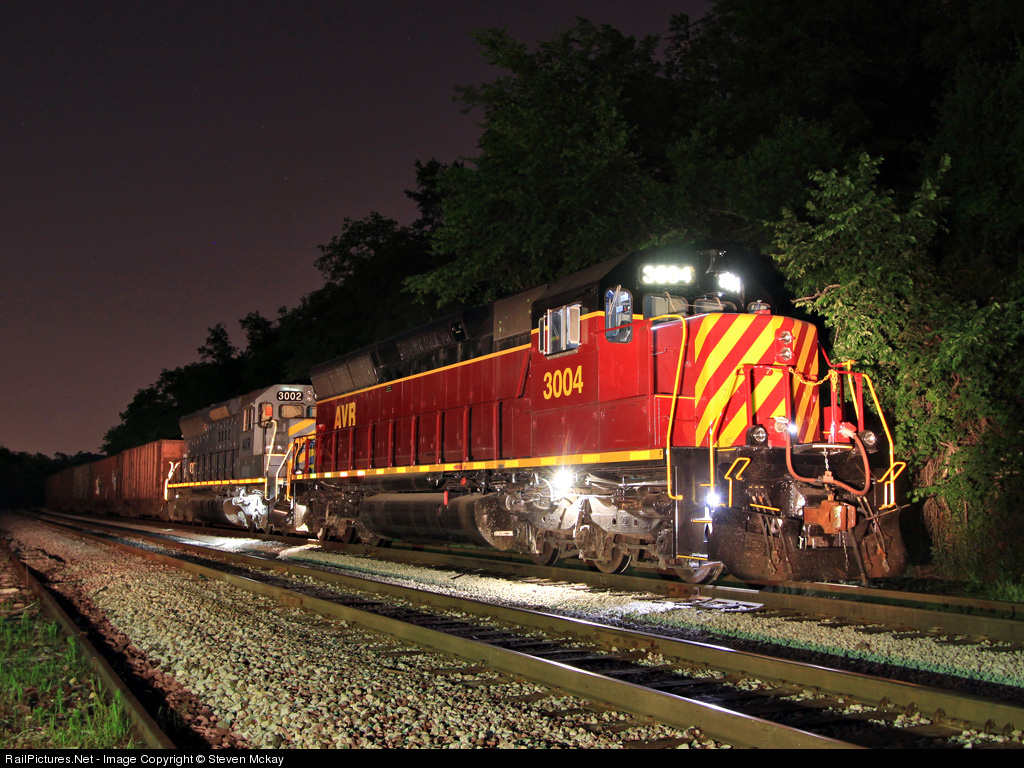 | Dropped off only a few minutes prior by WE 611, which took the third engine off this train SWP 2006 back to Rook with 7 cars, AVR 3004 and 3002 sit at the AVR/WE interchange with 60 loads of coal. 3004 has only been on the property for a few months and is the only SD40-3 to wear the Maroon, Yellow and Black. |