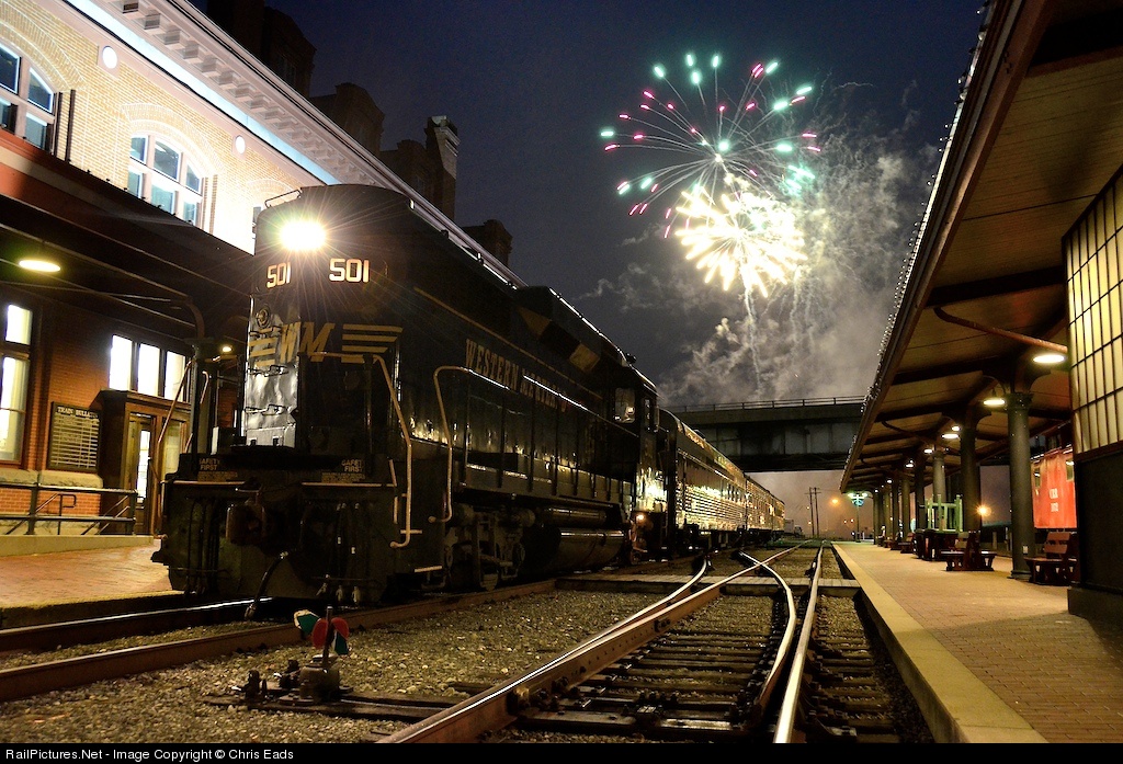 | Cumberland, MD 5/26/2012 - Western Maryland Scenic Railroad's GP-30 501 is backing the consist of a special evening dinner train from the former WM Cumberland station towards Ridgeley Yard as Memorial Day celebration fireworks explode overhead. |