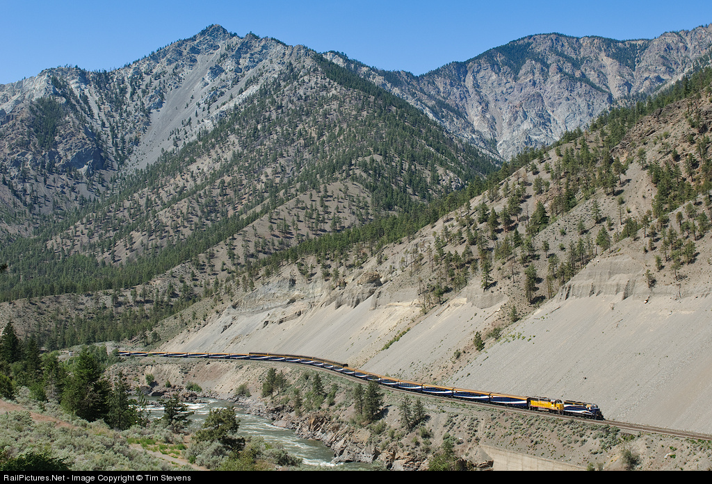 The eastbound Rocky Mountaineer proceeds east on CN's Ashcroft Sub hugging the shores of the Thompson River, heading down the siding at Morris where it will meet a set of coal loads.