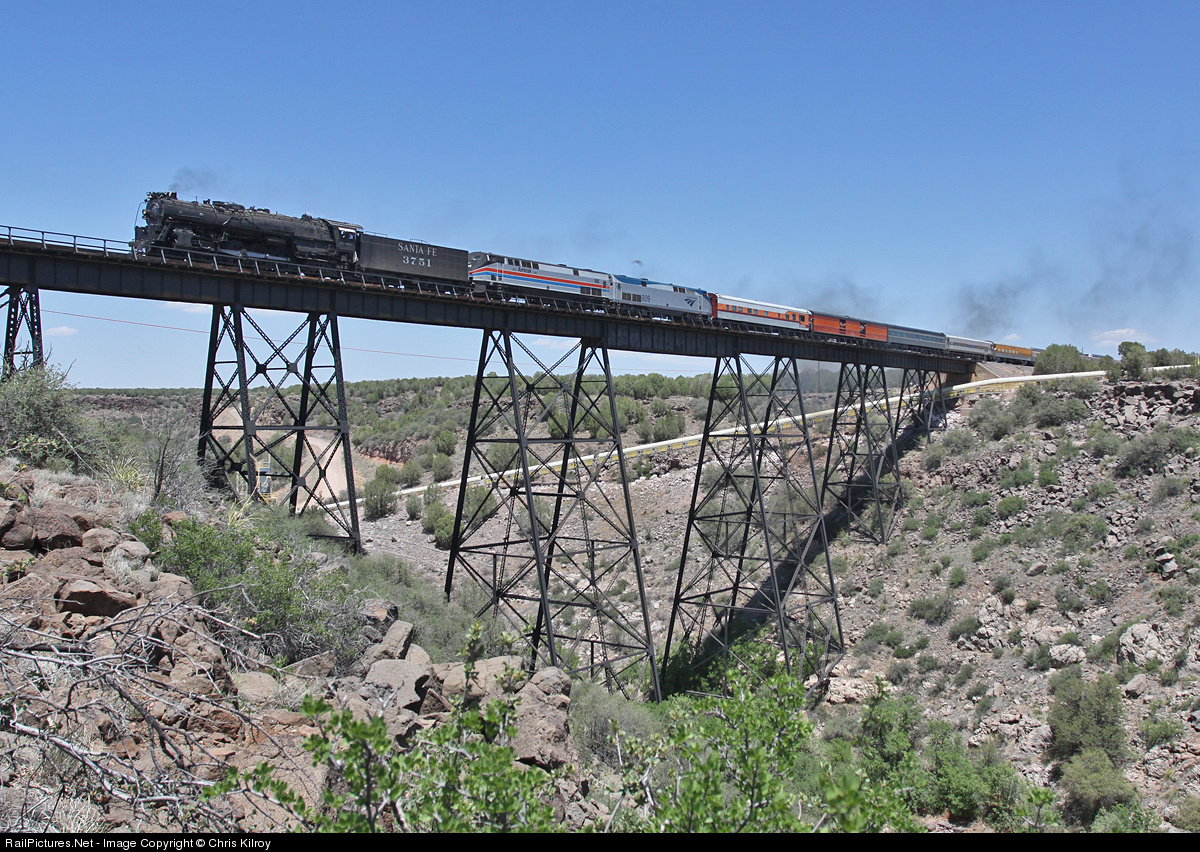 The AT&SF Grand Canyon Limited is seen crossing the impressive bridge over Hells Canyon near Drake, Arizona as it makes its way southward on the Peavine toward Matthie. There, the train will leave BNSF's main line and head across the Arizona & California RR to Parker, AZ for the night.
