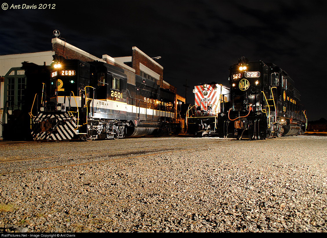 SOU 2601, NS (original) 1616, and N&W 522 pose together next to the North Carolina Transportation Museum Roundhouse during a photoshoot. Lighting provided by Clint Renegar.