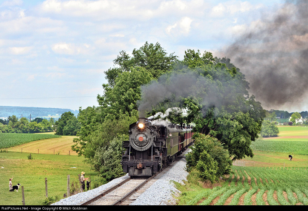| "An Amish Greeting" Strasburg Railroad's 2-10-0 #90 clears one of the line's three "tunnels" to greet an Amish farmer and son team working on a fence. To the right, a lone cow, to the far left - the farmer's daughter stands with her trusty collie, waving to the engineer. This must be Paradise! |