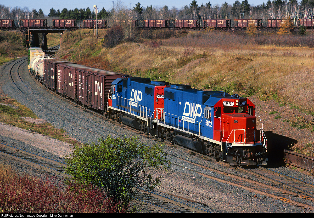 On October 19, 1985, a DW&P transfer bound for C&NW’s Itasca Yard passes through Saunders, Wisconsin. The train is powered by two freshly-painted ex-Rock Island GP38-2s. Overhead is a BN taconite ore train headed for the docks at Allouez on Lake Superior.