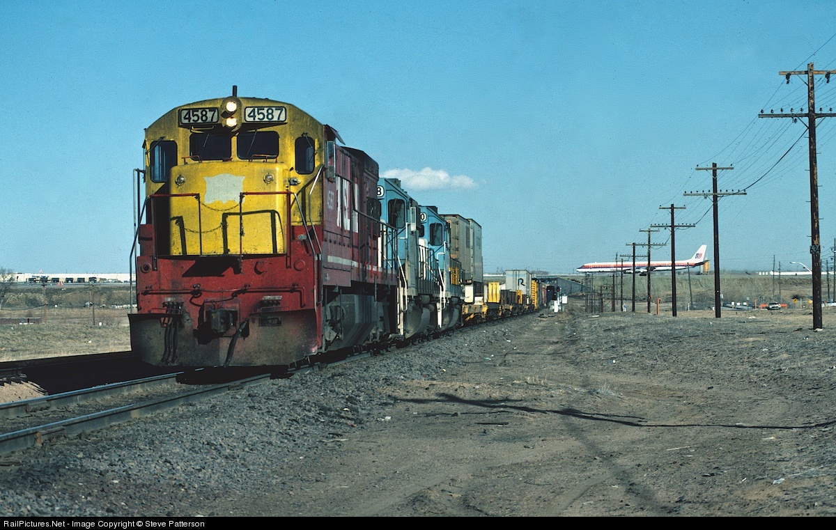 A United jet has just landed and is taxiing to the terminal as a Rock Island gets underway eastbound on UP track. At Limon, Colo., Ex. 4587 will enter CRI&P track on east to Kansas.