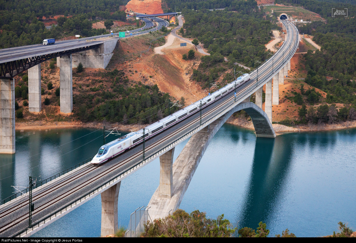 High speed trains class 102 and 112 are called "ducks". Here we can see a "duck" from Madrid to Valencia crossing Contreras viaduct at 300 km per hour.