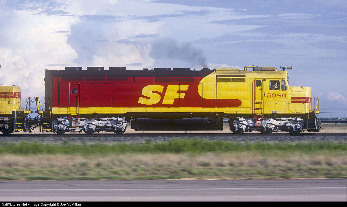 F45 5986 leads the X-AMAM west near Joel, Texas. The train originated at Amarillo, Texas, and is distributing empty grain cars to country elevators on Santa Fe's Hereford Subdivision (Transcon main line between Amarillo and Clovis, New Mexico). The train will later return to Amarillo.