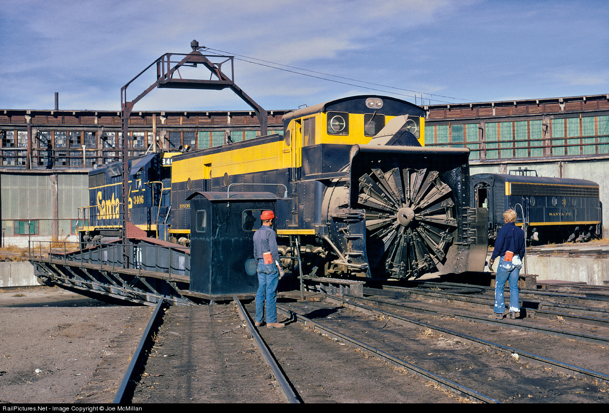 An Albuquerque switcher moves Santa Fe's rotary snowplow 199361 out of the roundhouse, where it was being stored at the time. Every so often the plow would be moved about to lubricate the bearings, etc. This was the company's only rotary at that time. The plow would later see action in Illinois and Kansas.