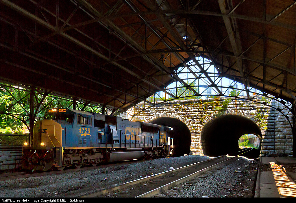 CSX #4726 makes a royal entrance under the wrought iron arches of the famed Mount Royal Station shed located on the former B&O line, now a major CSX artery of the eastern seaboard. To the right, the former station platforms remain though the station itself, gloriously restored in 1967, is now home to the Maryland Institute College of Art. The shed, one of the few left in the United States, was restored in 1985. Special thanks to Dave Blaze for the inspiration to visit this famous but not often photographed location.