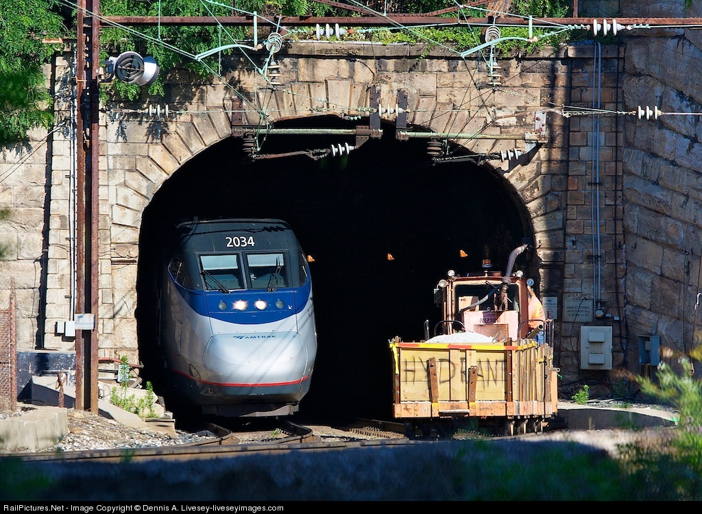 Like a snake in it's lair about to pounce on a little pink critter, northbound ACELA 2034 emerges from the obsolete, 139 year old, speed restricted B&P (Baltimore & Potomac) tunnel moments before arriving at Baltimore's Penn Station. (Yes, it was shot through a fence!)