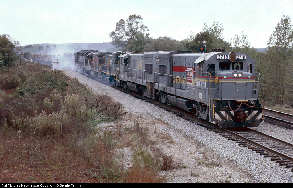 With a wave from the engineer, Seaboard System U23B #2719, U23B #2722, MP15T #1212, B23-7 #5102, GP40's 6724 & 6791, and U36B's 5771 & 5720) leads train 1st #329 southbound off Pine Mountain and into the siding for a train meet amidst a cloud of brake smoke. Seaboard System U23B #2719 was built March 1973 as Louisville & Nashville #2719 and later became CSX #3248