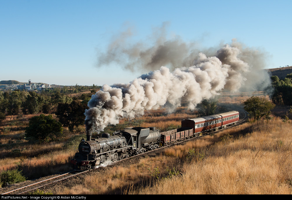| Friends of the rail's class 24 3664 brings a short mixed out of Cullinan with the Cullinan diamond mine in the background during the FOTR Cullinan photo weekend |