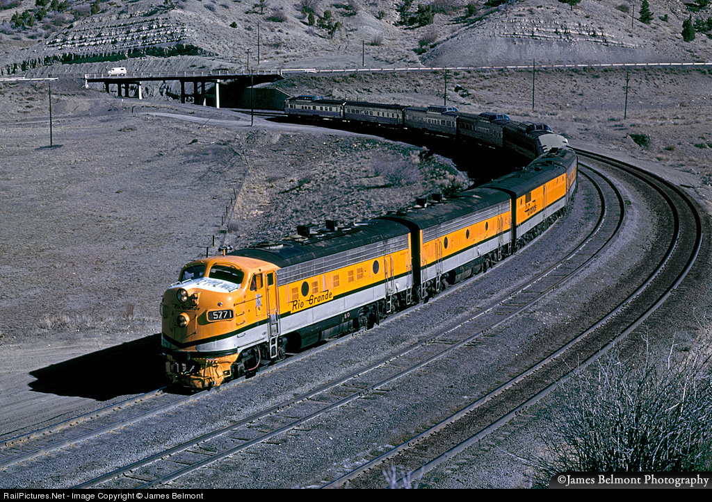 Rio Grande Aspen Gold paint stands out in sharp contrast to a monochromatic early spring landscape in the lower horseshoe curve at Gilluly. The Rio Grande Zephyr never failed to impress its Utah fan club as it climbed the 50 miles of relentless grade from Provo to Soldier Summit.