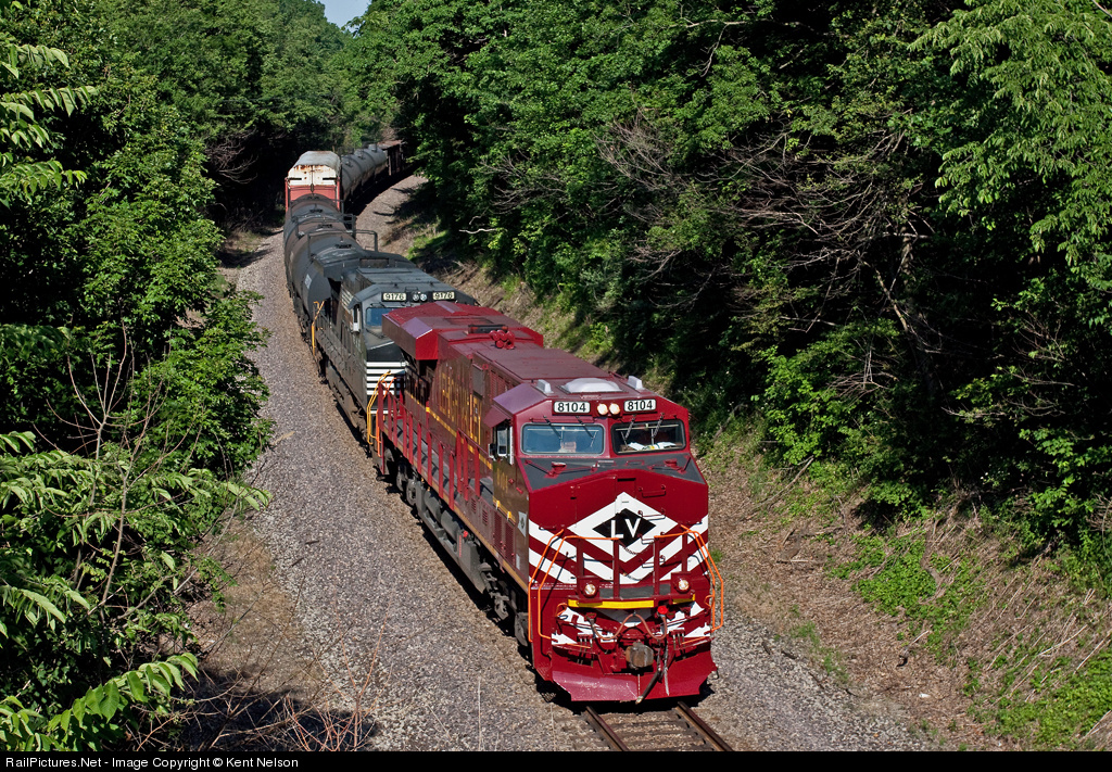 | LV 8104 is just released out of the paint shop after getting her nose repainted. The LV heritage unit leads NS 17K west just out of Peru, Indiana after making a crew change. |