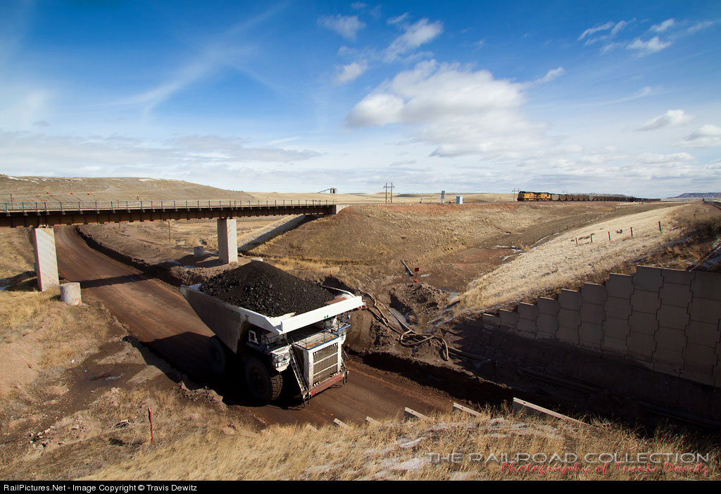Full trucks of coal head to the Black Thunder processing plant as a Union Pacific train waits to depart the former Jacob's Ranch Mine now part of Black Thunder.