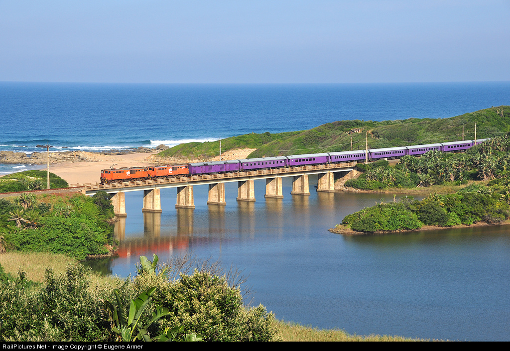 A rare sight indeed! A Premier Classe set belonging to passenger operator Shosholoza Meyl, runs alongside the Indian Ocean on the 'South Coast' line, crossing the Umgababa River, just south of Umgababa station. The train was doing a promotional trip from Durban to Umkomaas and return, for delegates attending the annual Indaba tourism trade show in Durban.