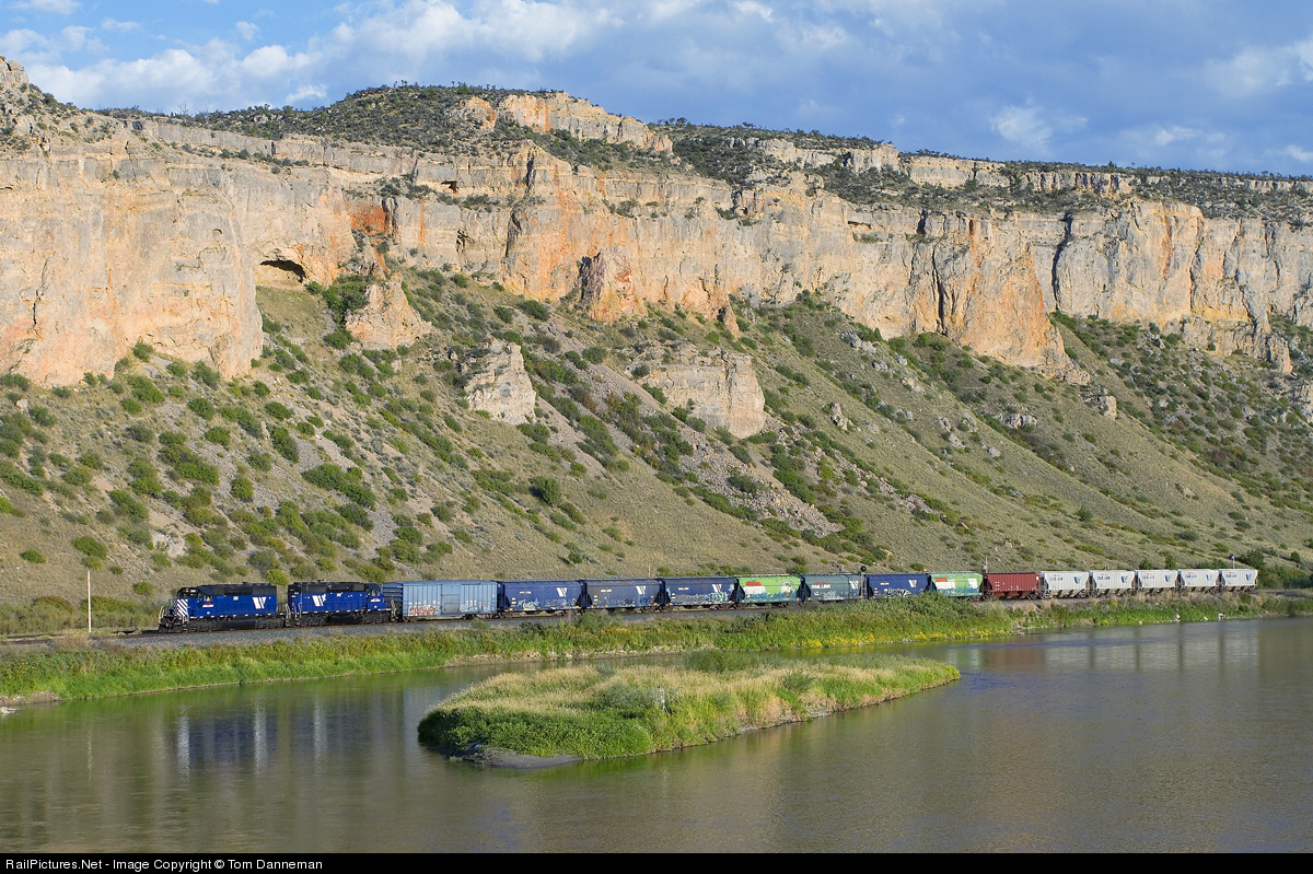 Montana Rail Link’s 840 Local is heading back to Helena, Montana, as it rolls through Lombard. Part of the hillside in the background came down and blocked the Northern Pacific main during the 6.6 magnitude earthquake of June 1925. SD40-2XR’s 252, and 253 lead the 14-car local this day.