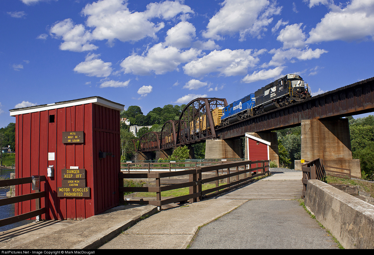 | H76 rolls into Pennsylvania via the ex-Lehigh & Hudson River bridge over the Delaware River at Easton with one of the very few remaining CR units trailing. The structures in the foreground are remnants of the Delaware Canal. |