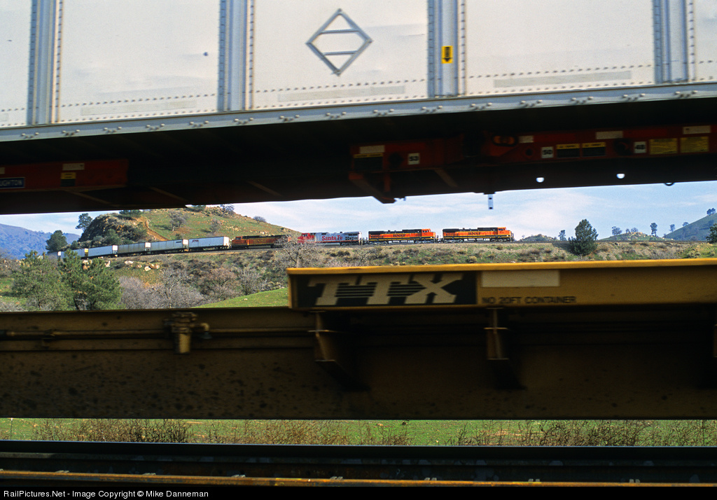 As the flats and spine cars of trailers roll by in the foreground, the locomotives of the same long BNSF train climb around Tehachapi Loop in California on March 8, 2001.