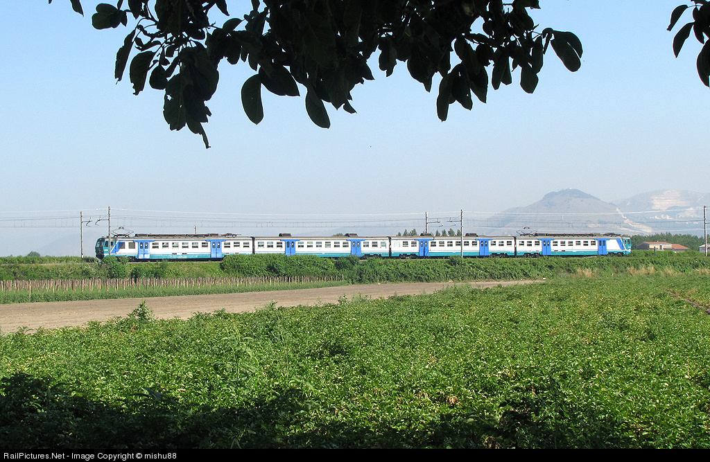 Being a foreign turist in this country of mountains, plains full of tabac and potato cultures, I don`t even know the locomotive number, train ID or EMU type... But even so, with +35 Celsius degrees, with a bottle of water and a hired bicycle, I tried to manage a Napoli - Benevento bike trip and capture some FS or TrenItalia or MetroCampania NordEst rolling stock, like this 4-unit EMU. In behind you can see the mountains scraped by the limestone quarries, and in front of the train a camp full of potatoes...