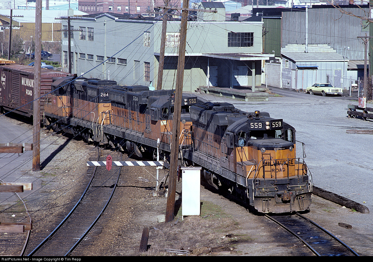 With less than a month to go before the March 1980 embargo, Milwaukee's Sumas Turn crosses the BN mainline along the Bellingham waterfront. After adding a few cars, the train will head for Tacoma on BN rails as Train 905, the Bellingham Time Freight. Power for the train includes rebuilt SD10s 559 and 550, and GP9 284.