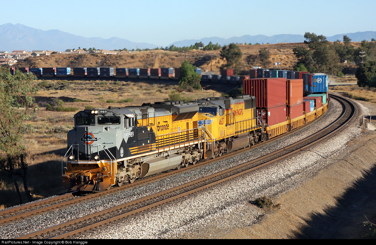 | UP's Rio Grande Heritage ACe rounds the big curve at Beaumont with Long Beach, CA to Shreveport, LA stacks. |