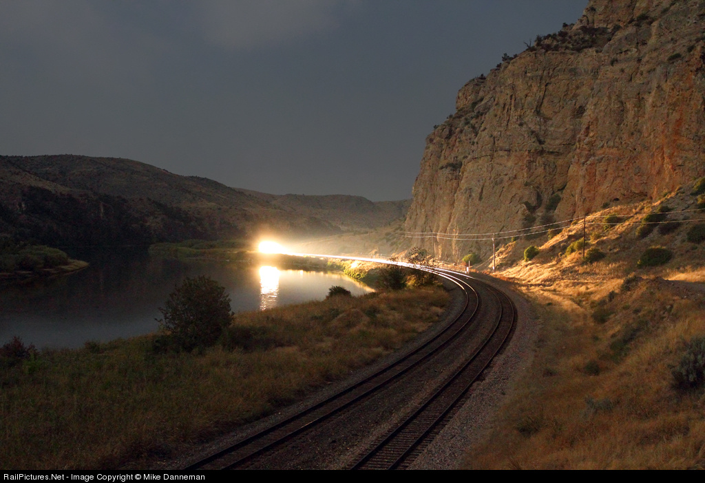 Lombard nocturne At 11:07 p.m. on the night of September 11, 2011, a BNSF coal empty lights up the cliffs at Lombard, Montana, on the scenic Montana Rail Link.