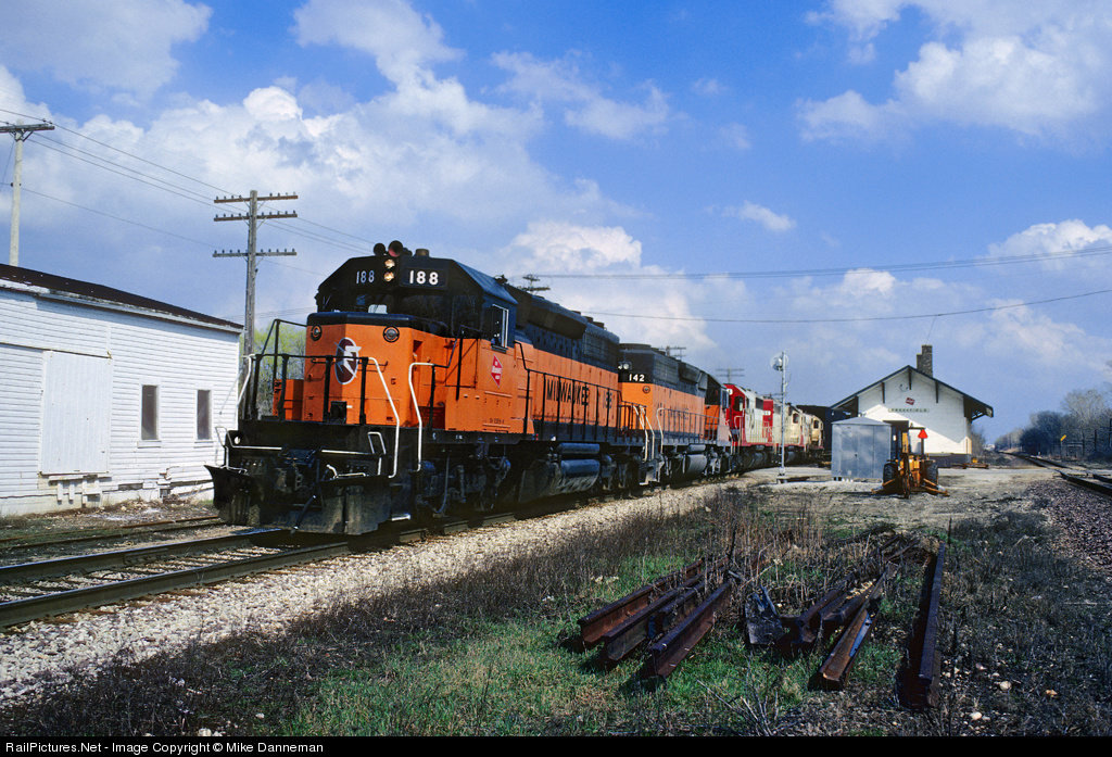 Milwaukee Road SD40-2 No. 188 leads the westbound hotshot on April 5, 1986, at Brookfield, Wisconsin. The Soo Line merger is now at four months with the Milwaukee, but the orange and black locomotives still look good, especially in new “Hiawatha” paint.