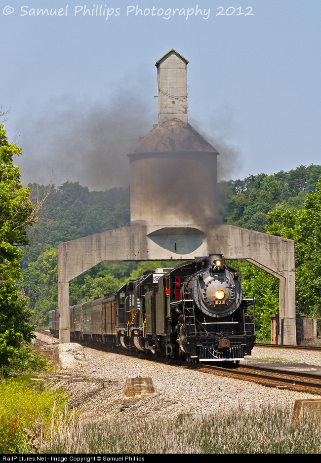 | Steam on Christiansburg Mountain for the first time in 18 years! On the first run of the day, NS 958 blasts underneath the coaling tower at Vicker as the train sprints uphill for Christiansburg. |