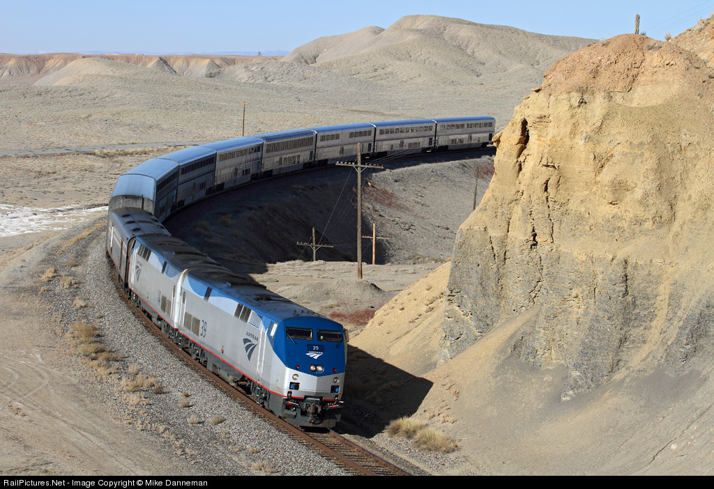 Cresting Thompson Hill Amtrak’s eastbound California Zephyr glides around the big curved fill east of Thompson, Utah, on the morning of March 4, 2012.