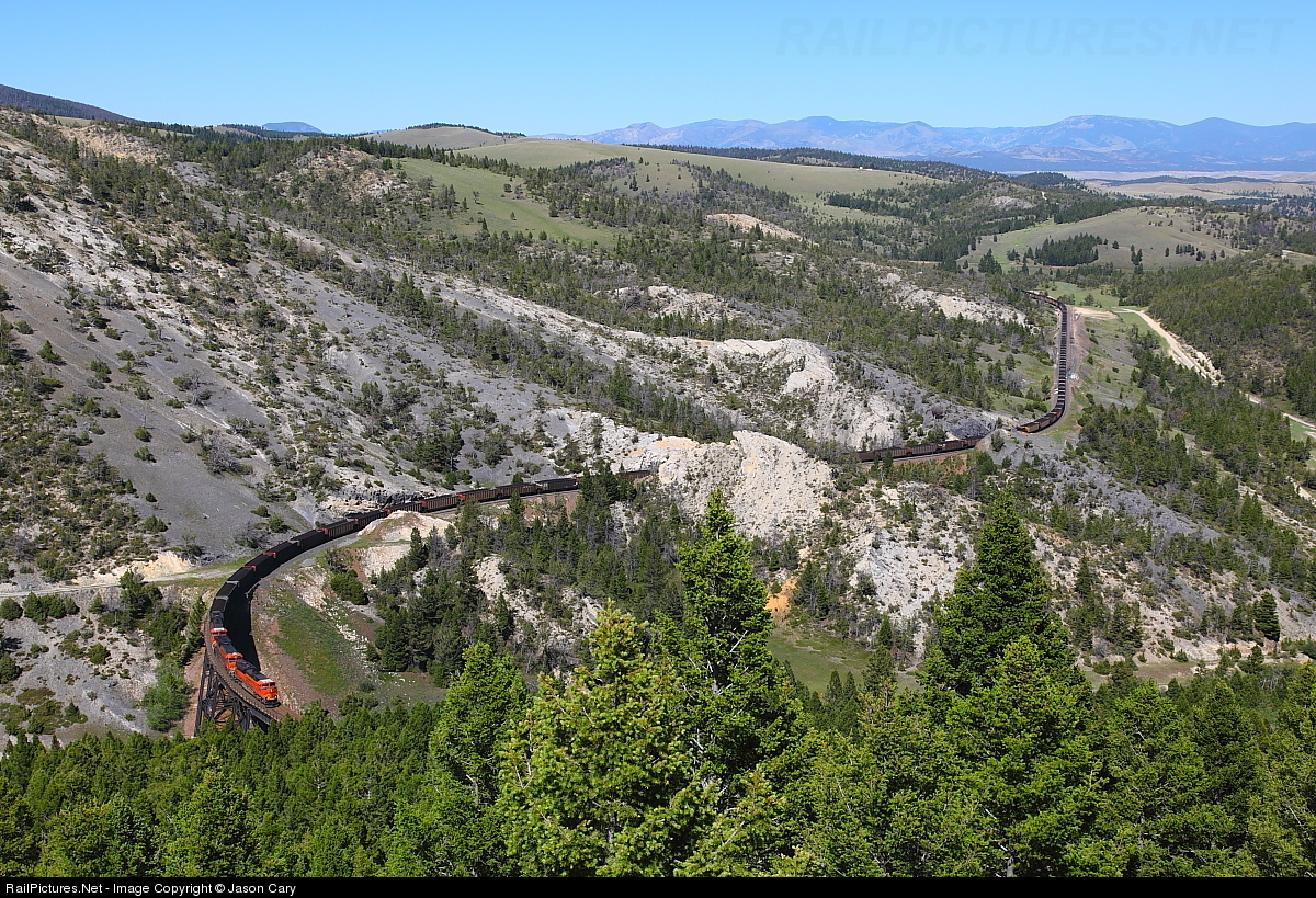 Export coal is running heavy over MRLs Mullan Pass. This train lead by an SD70ACE came into Helena powered up 3x1. The train added its manned swing Helper at Helena. The helper is visible at the west end of the former Skyline siding. One of my favorite vantage points on Mullan Pass.