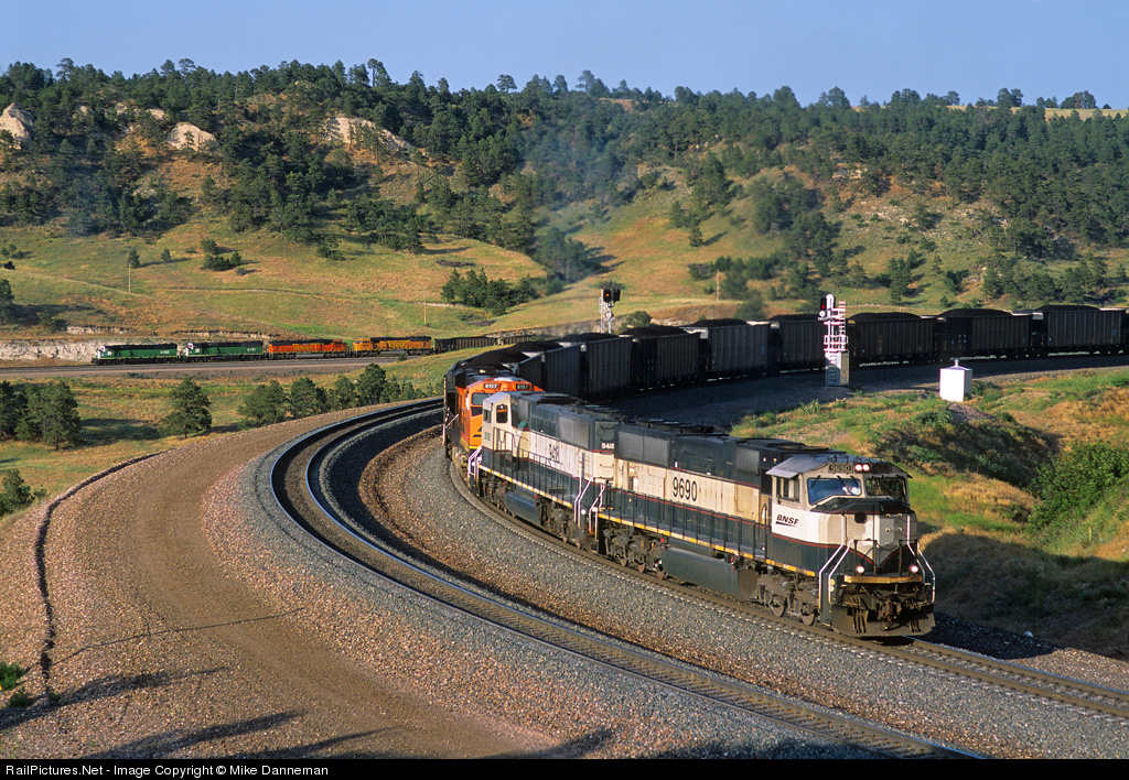 A BNSF coal train strains up Crawford Hill, Nebraska, on the afternoon of July 11, 2008. The head end is swinging around Windy Point (a.k.a. Breezy Point) while a set of helpers consisting of a SD75M and two SD60Ms push on the lone rear DPU in the background.