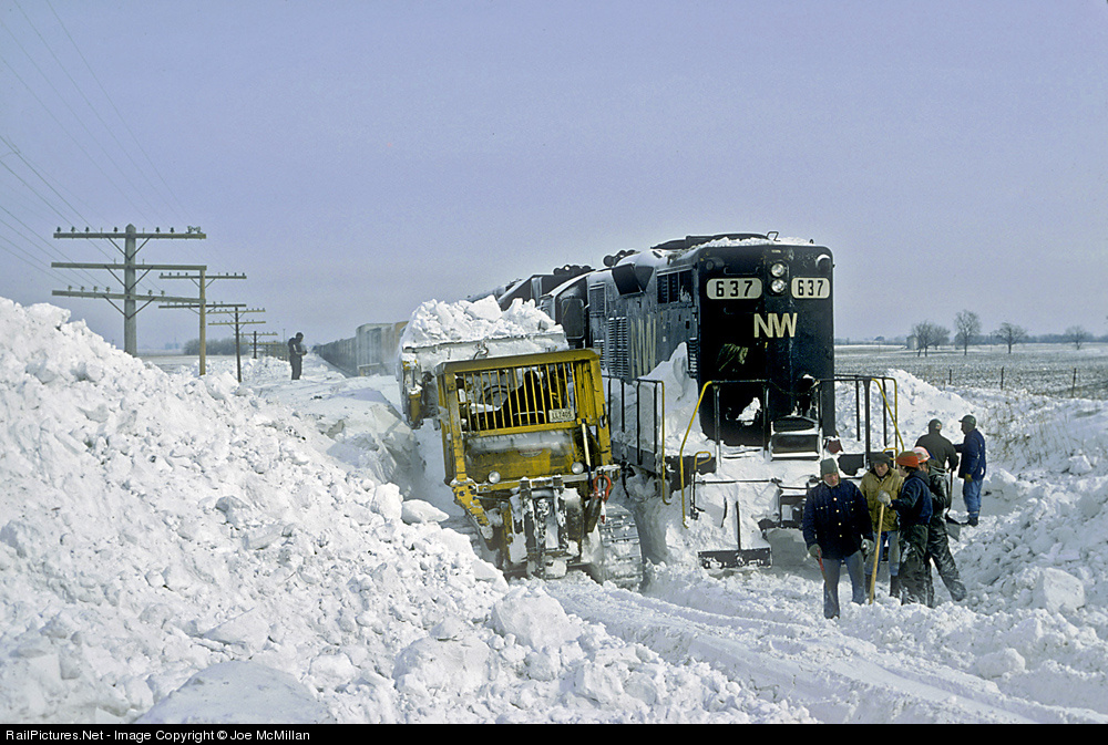 | The winter blizzards in the Midwest in February 1977 wreaked havoc on the area's railroads. This southbound N&W freight became stranded in a snow-filled cut just north of Emington. It was rescued by a borrowed UP rotary snowplow, and now a front loader is clearing the sides of the locomotives. Shortly, UP diesels will couple to the N&W train and will break it loose. |