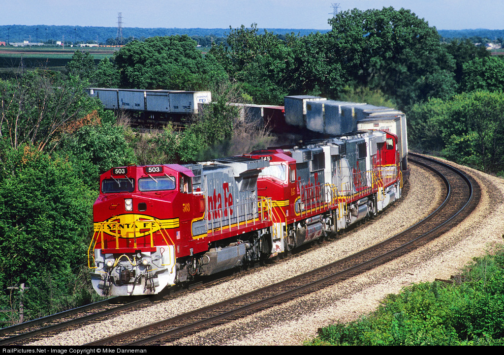 Santa Fe’s hot 199 train roars through Houlihan’s Curve west of Chillicothe, Illinois, on June 20, 1992. Trailing the lead GE Dash 8-40BW in the all-Super Fleet consist is an A-B-A set of EMD GP60s (GP60Ms and a GP60B).