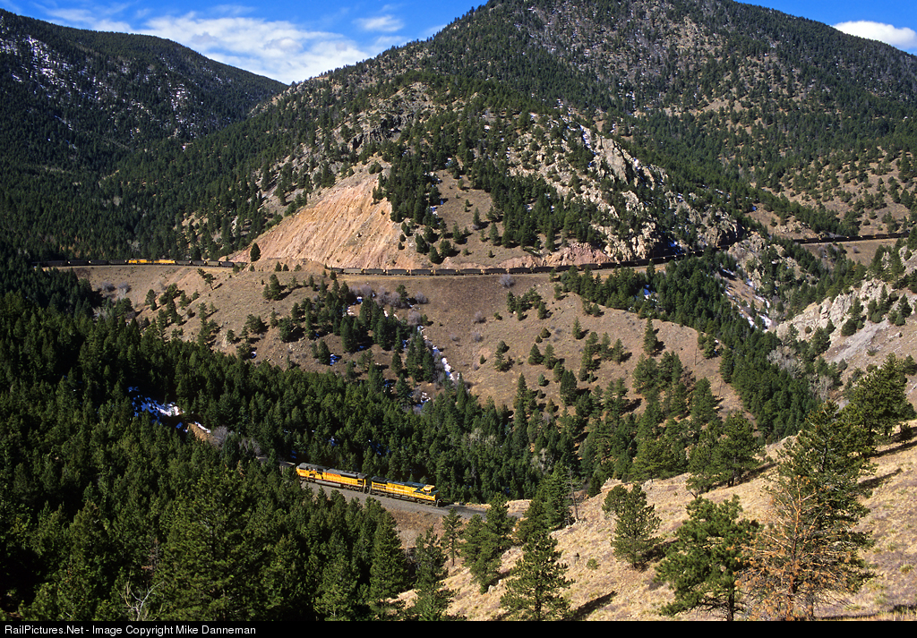 With a former C&NW AC4400CW in the lead, a Union Pacific coal train drops down the 2% grade out of Tunnel 15 and is about to enter Tunnel 14, near Crescent, Colorado, on March 30, 2002. The rear of the train is still in Tunnel 17, while the mid-train DPUs are on a fill approaching Tunnel 16. The large cut is the former Tunnel 17, now daylighted, and this horseshoe is in a location called South Draw where South Boulder Creek flows north toward Boulder Creek.