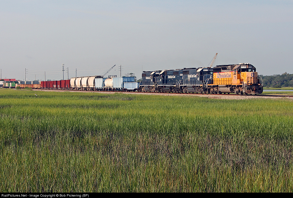 FEC 226 crossing the marshes with a bit of an unusual consist, four motors and some cars from NASA (the light blue cars).