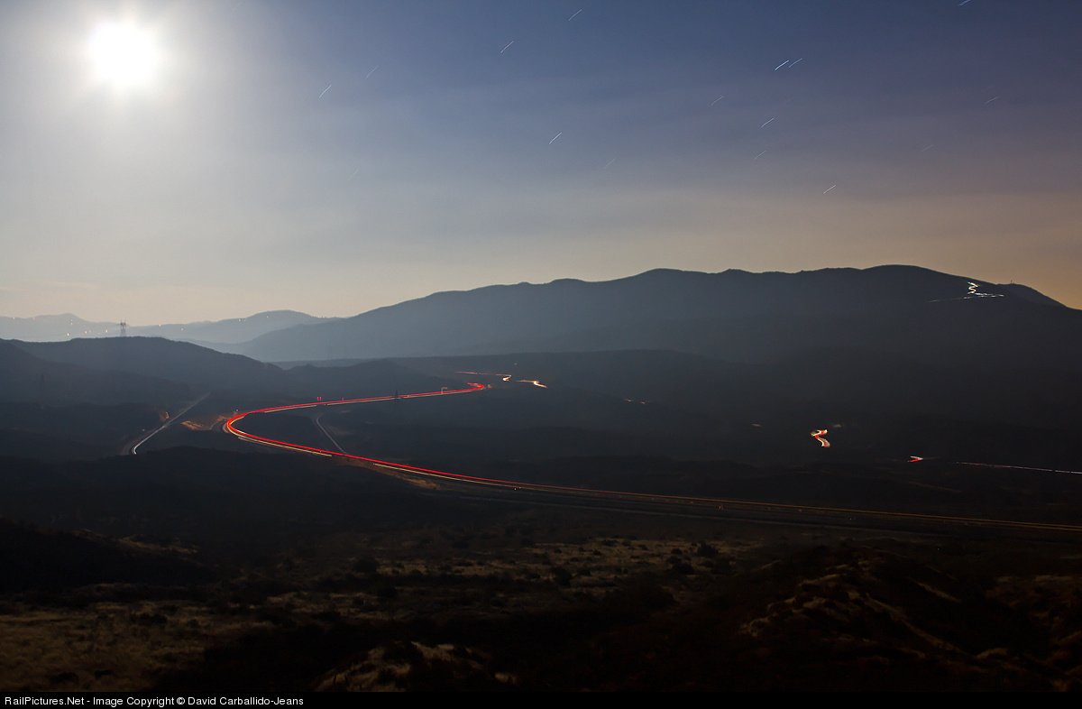 The eastbound Southwest Chief climbs up Cajon Pass at Silverwood as the full moon lights up the pass on a warm July night.