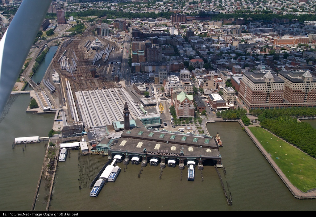 From a Cessna at 900' over the Hudson, here is a midday aerial of Hoboken Terminal on July 2nd, 2012. This terminal is surprisingly compact. On the ground it seems large; from the air, it becomes apparent how crowded it really is. Note also that the ferry slips are back in use, with NY Waterway ferries parked at some of the improved docks.