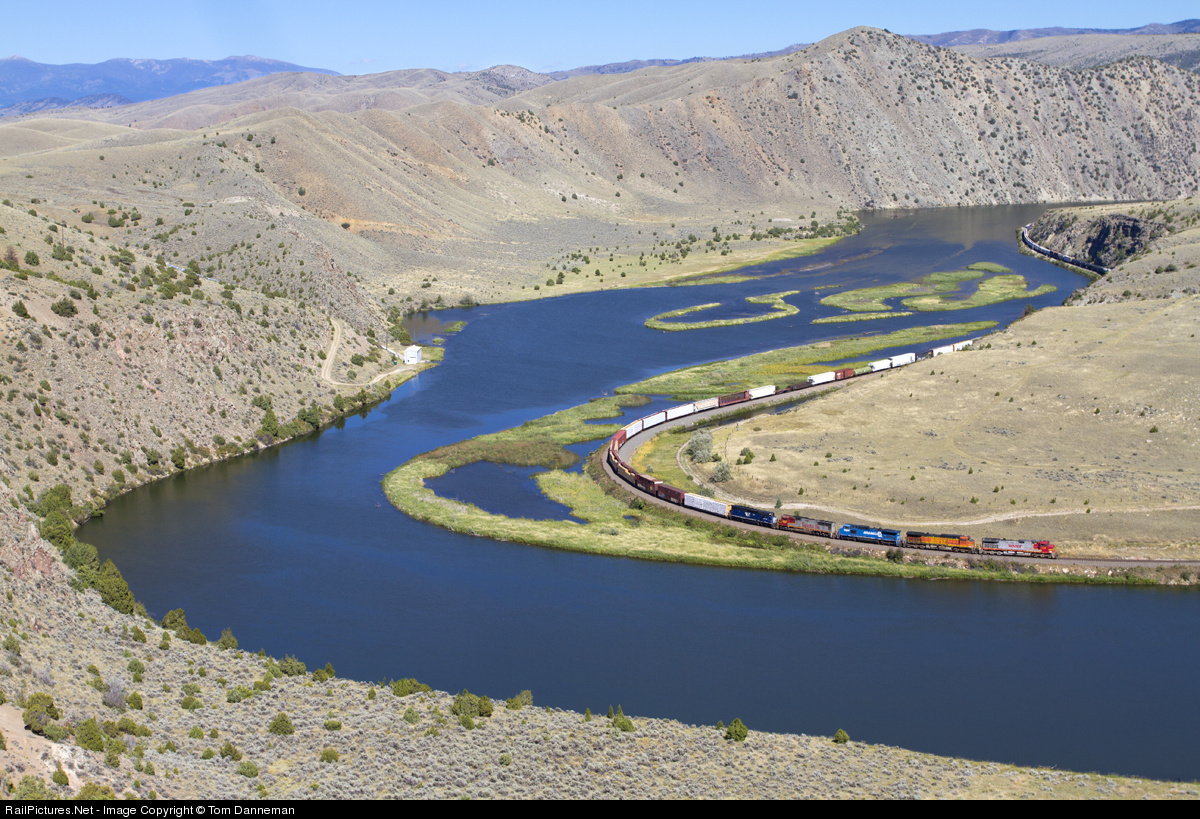 A BNSF eastbound freight on the Montana Rail Link, rolls along the Missouri River near Lombard, Montana. The eastbound train has a colorful consist which includes a Norfolk Southern (former Conrail) C40-8W, a BNSF SD75, and the Montana Rail Link no. 290. The 290 is a former Great Northern/BN SDP40 which was rebuilt by the MRL into a SDP40-2XR.